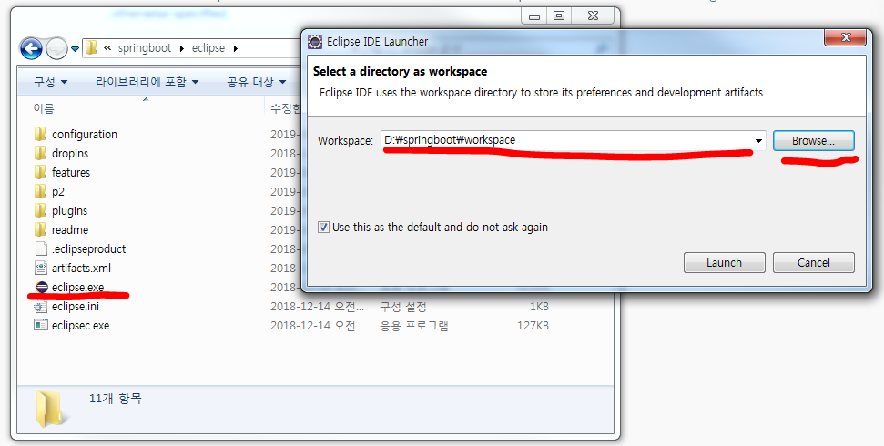이클립스를 실행하면 workspace를 선택하는 창이 나옵니다. springboot에 workspace라는 폴더를 만들고 해당 폴더를 선택합니다.