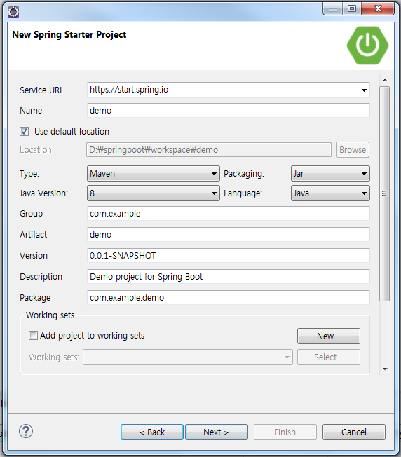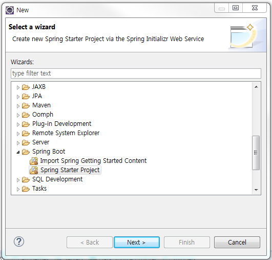 메뉴 : File > New > Other > Spring Boot > Spring Starter Project 를 선택하고 Next 클릭