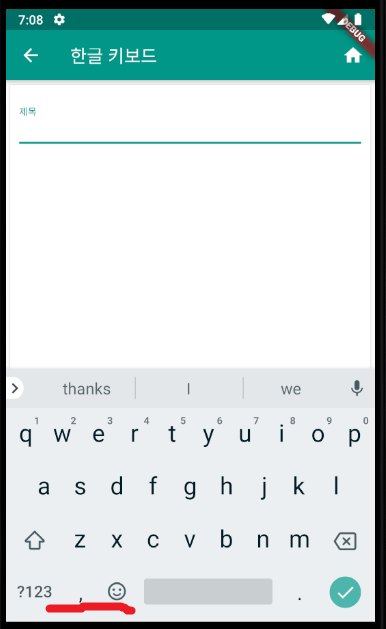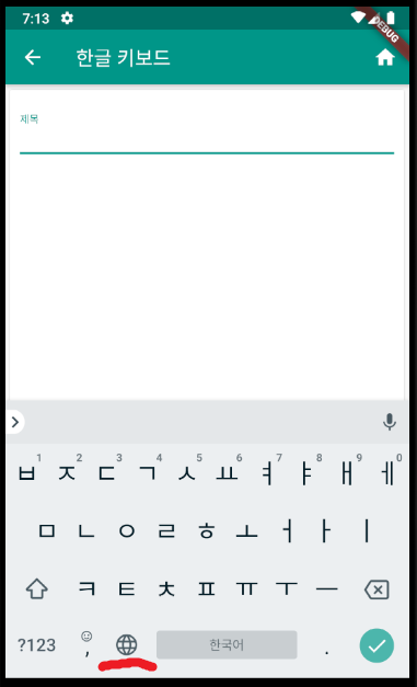 실행하는 앱으로 가보면 한글 키보드가 우선선택되는 것을 볼수 있다.