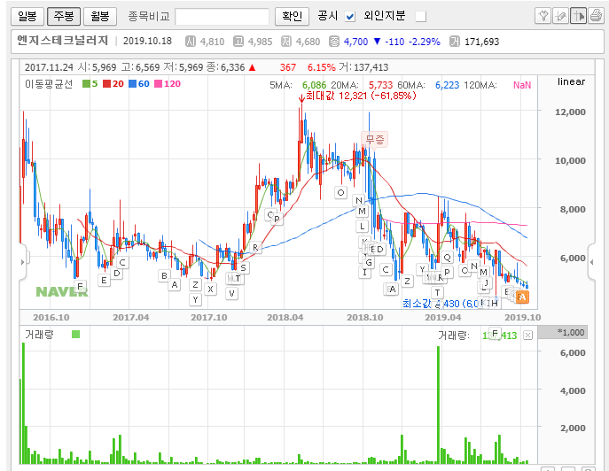 신규상장 패턴 상 여기서 더 밀리면 지하실. 4천원 깨지면 꼭 손절