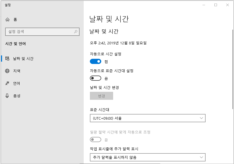 중간쯤 날짜 및 시간 변경 버튼이 보이지만 자동으로 시간 설정이 켬으로 되어 있으면 클릭이 되지 않는다.