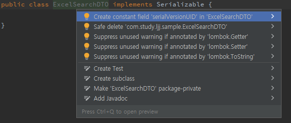 설정 후 클래서에서 alt+Enter를 치면 아래처럼 가이드가 나오고 선택하면 자동 입력된다.