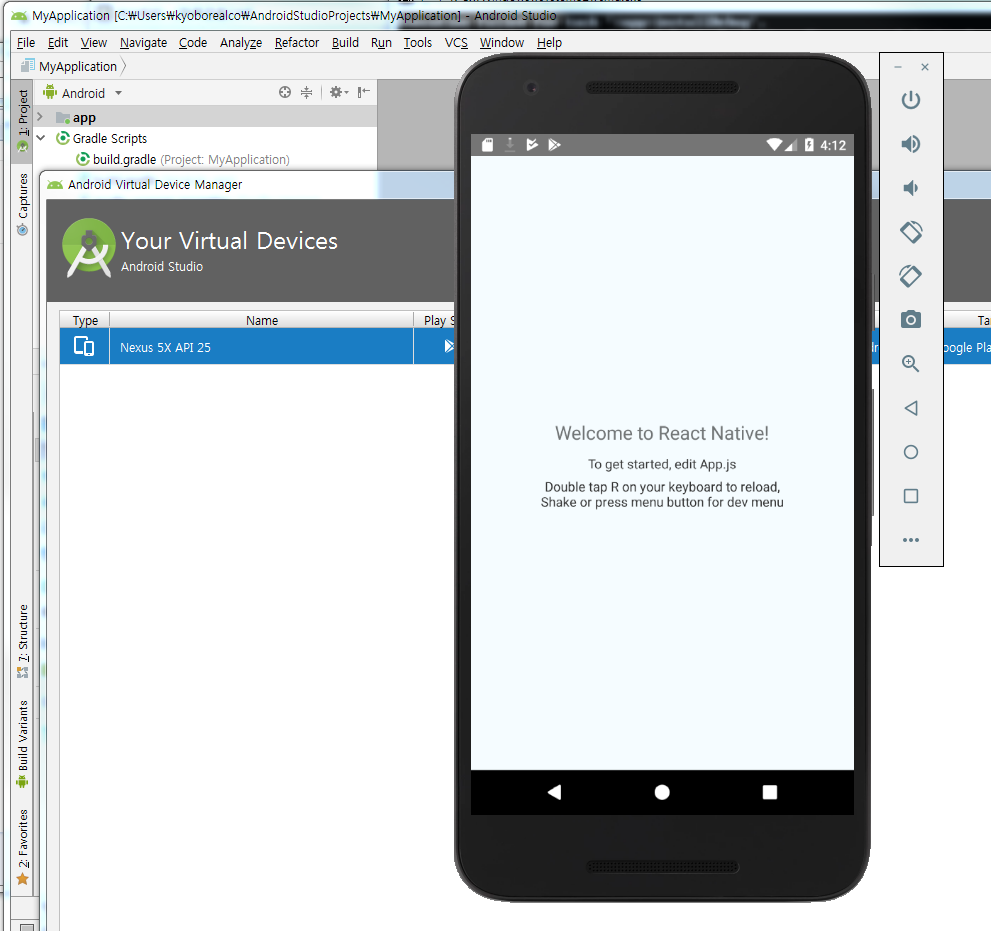 여기서 디바이를 더블클릭하여 버츄어 디바이스 실행 후