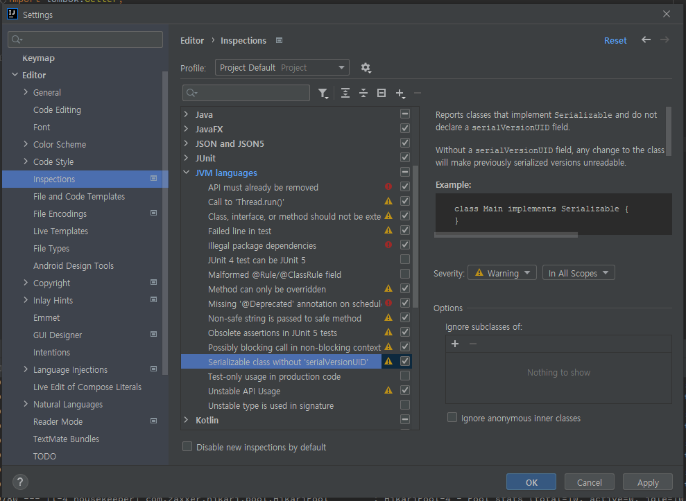 Settings > Editor > Inspections > JVM languages > Serialziable class without 'serialVersionUID'